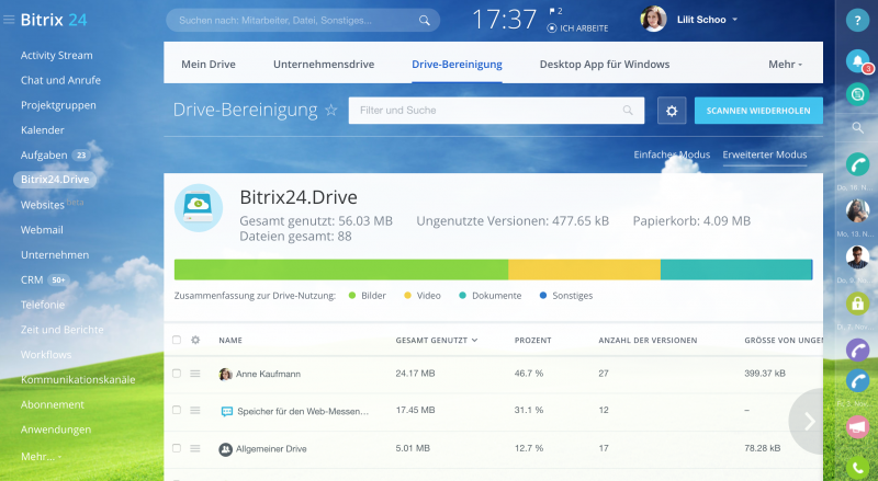 Der erneuerte Bitrix24 Drive bietet nun detaillierte Informationen dazu an, wie viel Onlinespeicher belegt ist, welche Nutzer am meisten Speicher für sich beanspruchen und welche Dateien absolut gefahrlos gelöscht werden können. Begrenzt verfügbar im Rahmen eines Beta-Tests.